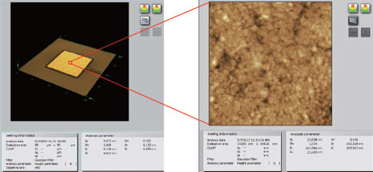 在非接觸式表面粗糙度測量中, 除了線粗糙度還可以測量面粗糙度。在面粗糙度測量中可以掌握樣品表面上指定區(qū)域內(nèi)粗糙度分布和特點, 并能夠與3D影像對照評價。OLS4500可以根據(jù)不同樣品和使用目的, 分別使用激光顯微鏡功能或探針顯微鏡功能測量表面粗糙度。