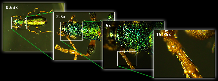 自動對接變倍(Auto Link Zoom, ALZ)功能可在切換物鏡后使視野保持一致。此功能可在進行完整個體拍攝時從宏觀到微觀提供平滑的放大,即您在切換物鏡后系統(tǒng)自動調整放大倍數使您看到的圖像與之前一致。