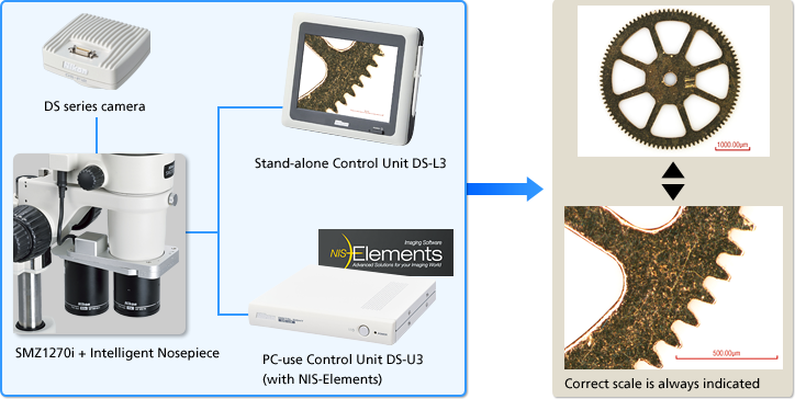 結(jié)合DS-L3相機(jī)控制器和NIS-Elements圖像軟件,SMZ1270i可以檢測變倍信息。同時,配合智能型P-RNI2物鏡轉(zhuǎn)盤配件可以檢測當(dāng)前使用的物鏡。變倍信息結(jié)合物鏡信息,系統(tǒng)可自動改變圖像標(biāo)尺大小,當(dāng)您在改變倍率時圖像中的標(biāo)尺與測量信息將會自動對應(yīng)。