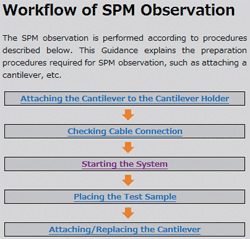 ![]() | 使用探針顯微鏡開始觀察之前, 可以在向?qū)М嬅嫔显O(shè)置所需的條件, 如安裝微懸臂、掃描范圍等。所以經(jīng)驗較少的操作者也能安心完成操作。 |