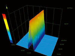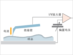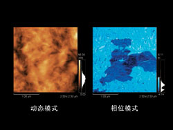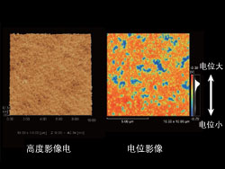 | ![]() Si電路板上的SiO2圖案樣品。高度影像(左)中 顯示為黃色的部分是SiO2。在電流影像(右)中 顯示為藍(lán)色(電流不經(jīng)過的部分)。通過上圖, 可以明確電路板中也存在電流不經(jīng)過的部分。 |