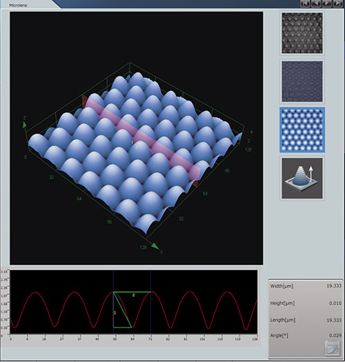 高度測量(微透鏡) | 激光顯微鏡采用短波長半導(dǎo)體激光和獨(dú)有的雙共焦光學(xué)系統(tǒng), 會刪除未聚焦區(qū)域的信號, 只將聚焦范圍內(nèi)的反射光檢測為同一高度。同時結(jié)合高精度的光柵讀取能力, 可以生成高畫質(zhì)的影像, 實(shí)現(xiàn)精確的3D測量。 |