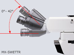 備有2種能以舒適姿勢(shì)觀察的傾斜鏡筒??梢愿鶕?jù)用途選擇雙目部?jī)A斜角度由水平0°到42°的、變化范圍大的MX-SWETTR型號(hào),或是目視和拍攝影像可同時(shí)觀察的U-SWETTR-5型號(hào)。